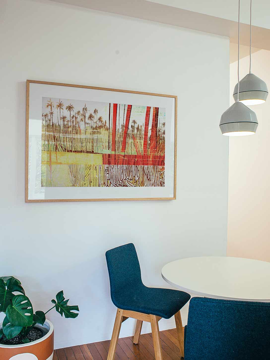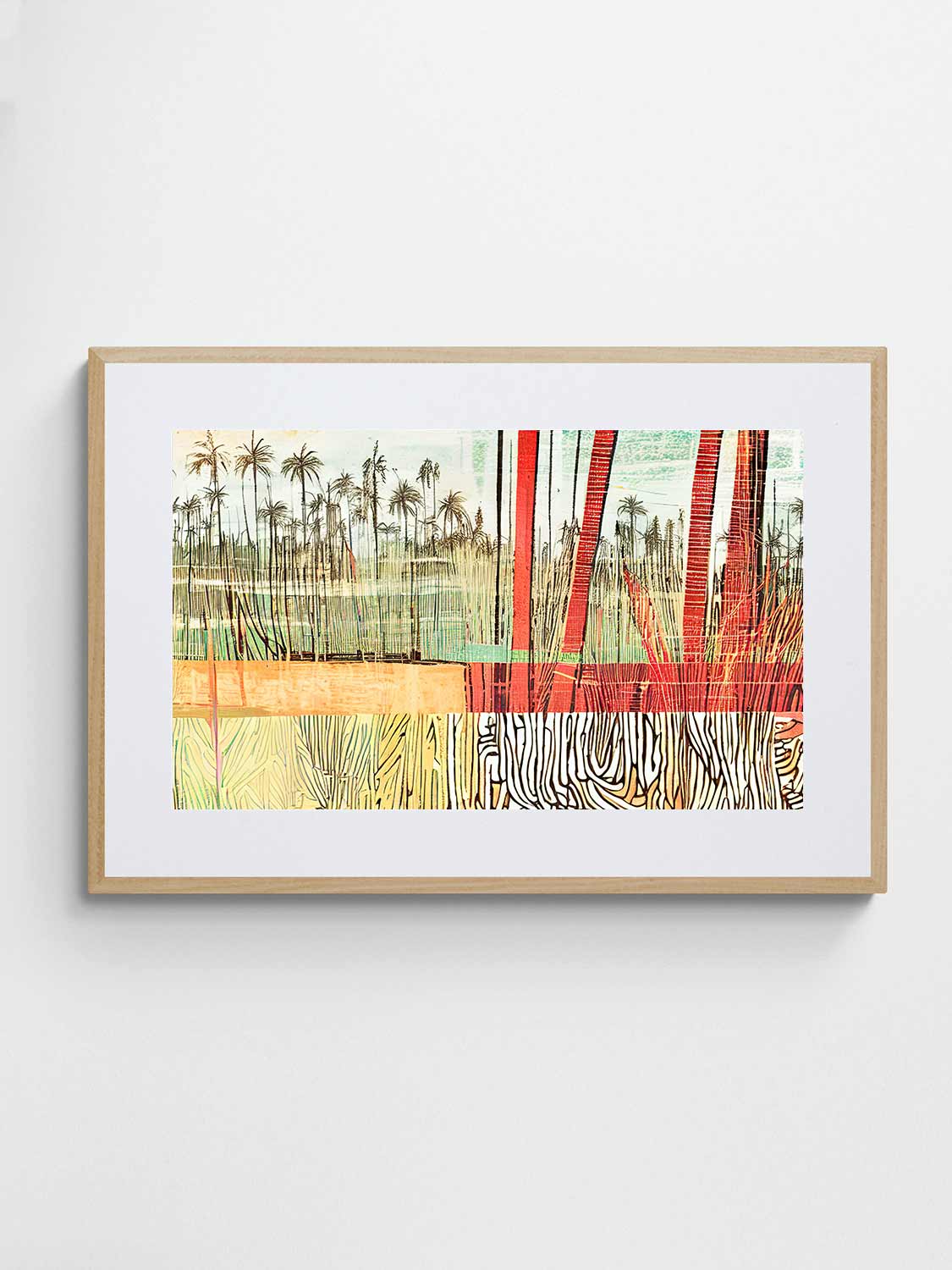 An Australian abstract landscape artwork featuring sugar cane fields over a palm backdrop. Mixed media print by Joseph Russell. 2023. Open edition.