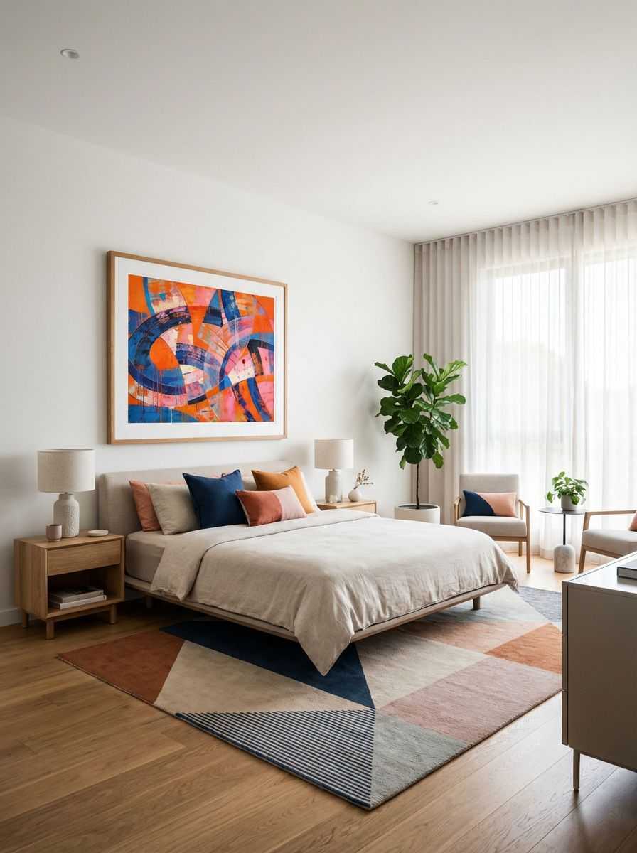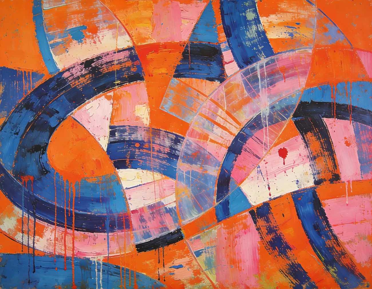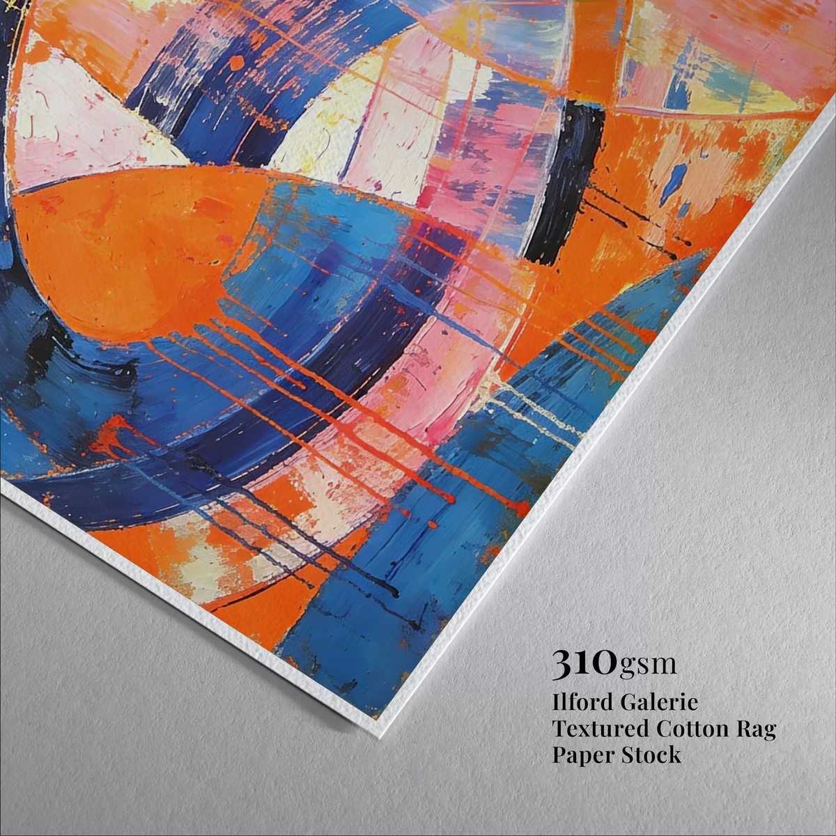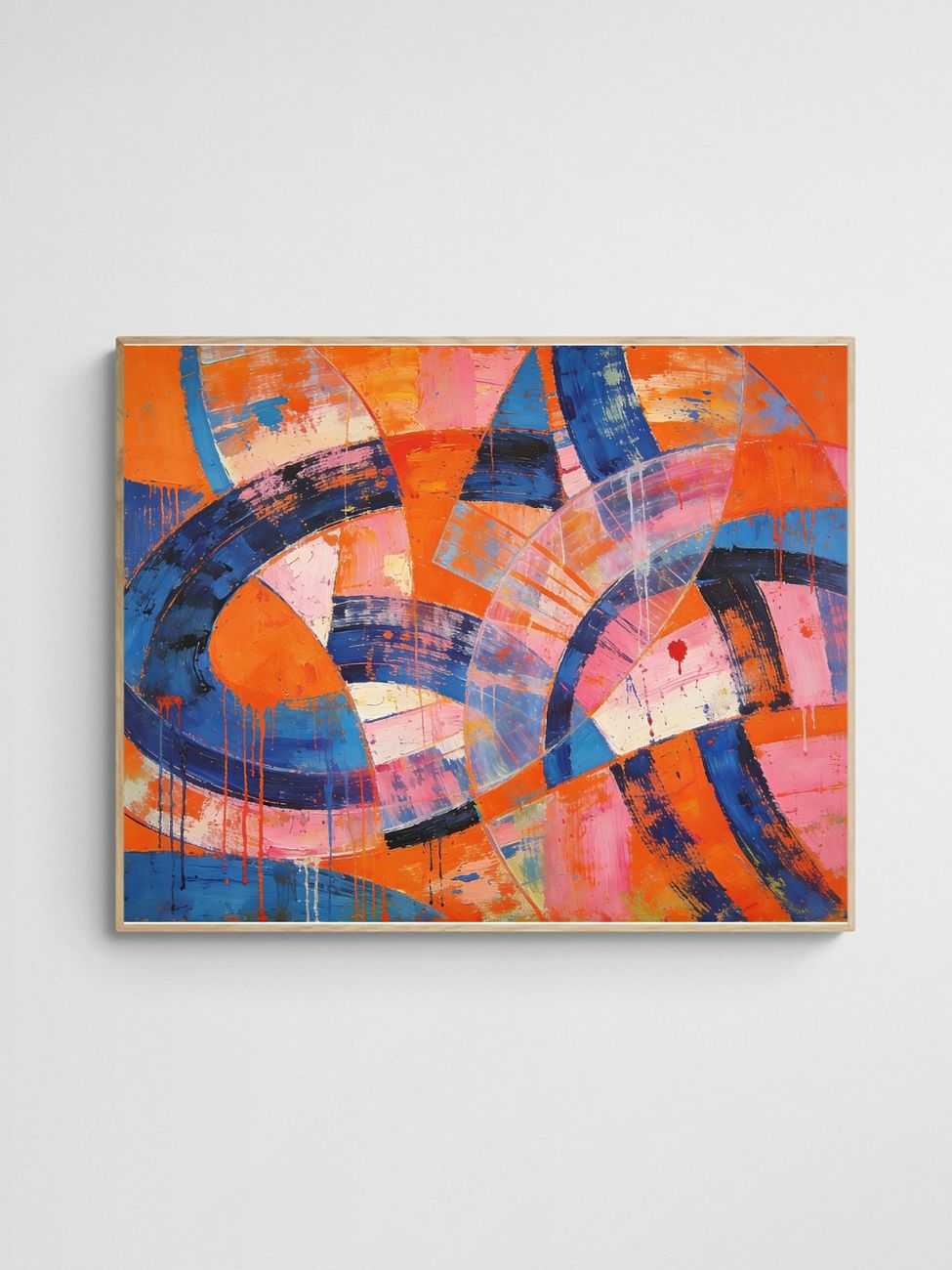 Immerse yourself in the energetic allure of ‘Chaos of Colour,’ featuring a captivating blend of dynamic geometric shapes and bold strokes. The artwork radiates with a vibrant palette of oranges, blues, and pinks, structured in an overlapping composition that marries complexity with movement. Textured layers of paint and spontaneous drips create a tactile dimension, while the curved lines and irregular brushwork amplify a sense of momentum and action. Perfect for bringing vibrancy and artistic sophistication to any interior space, this piece epitomises the chaotic beauty of abstract expressionism.