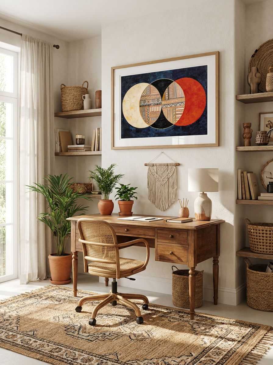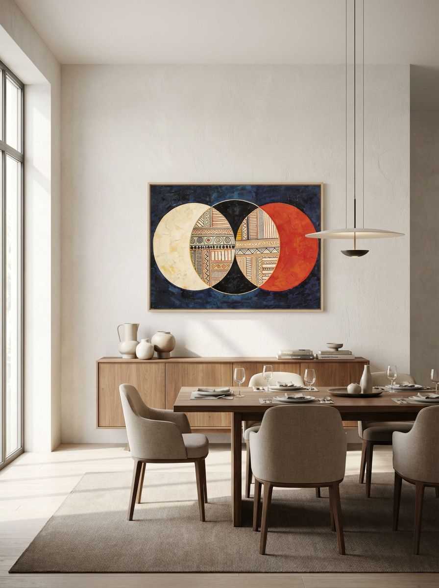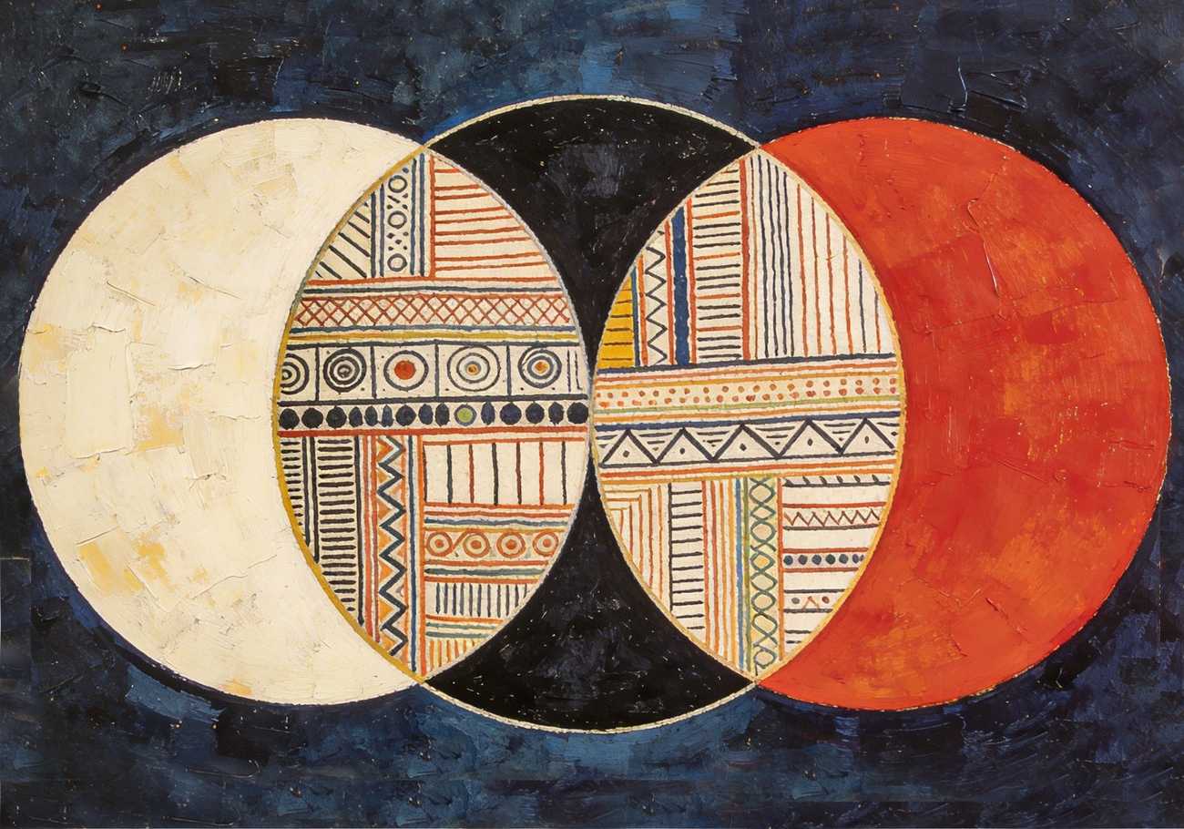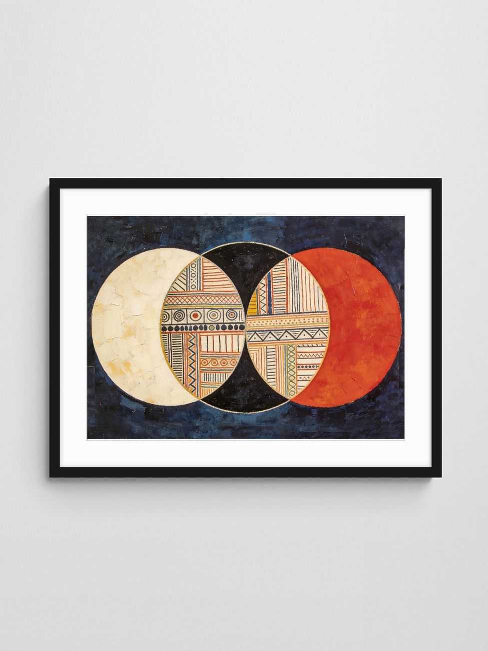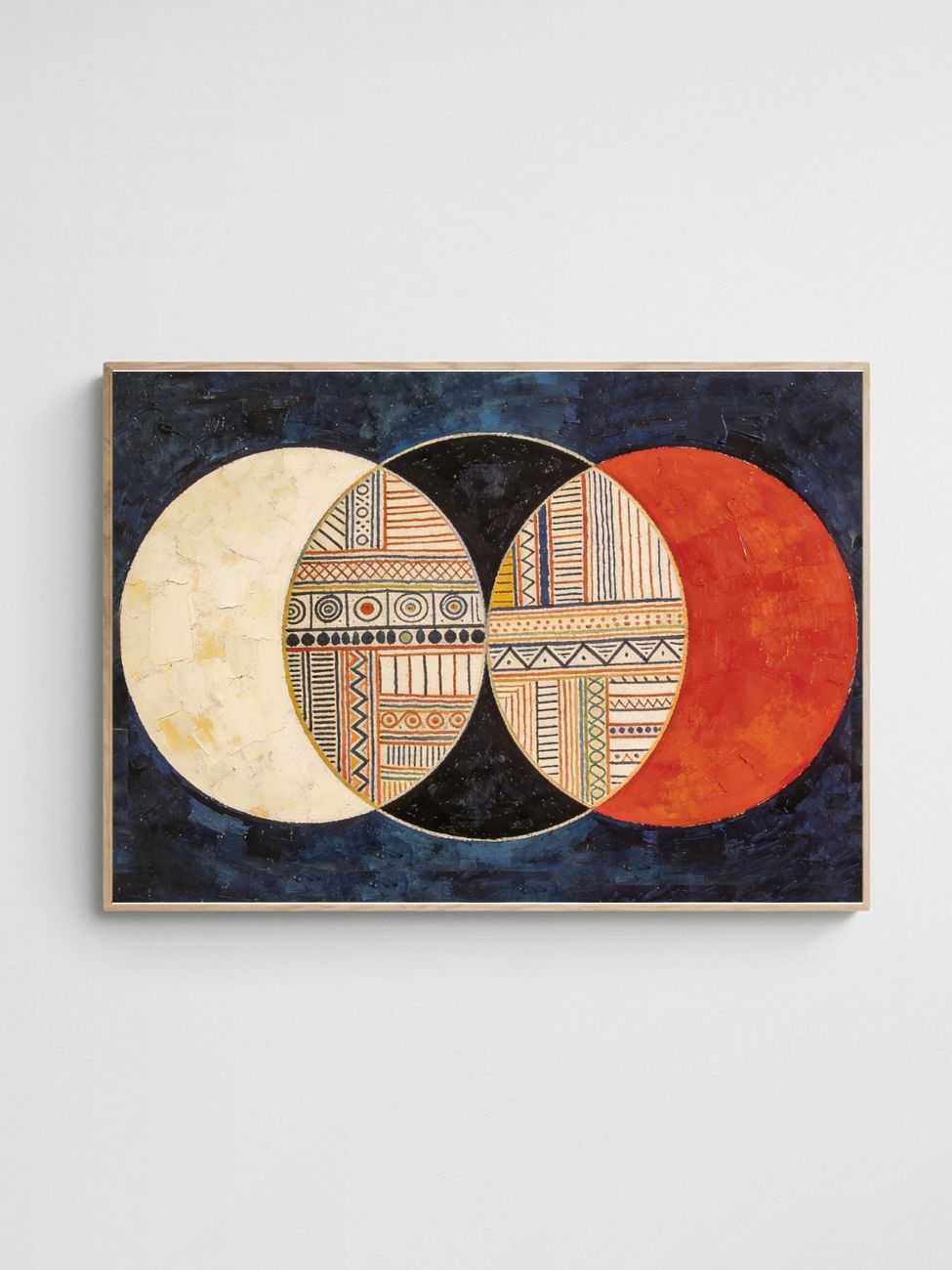 Bring artistic sophistication to your space with ‘Circles or Civilisation 1’, a striking fusion of mid-century geometric abstraction and intricate patterns. Bold overlapping circles in white, black, and rich red dominate the composition, while textured tribal-inspired motifs embellish the inner section. The deep blue background adds depth and contrast, making the artwork feel both timeless and captivating. Perfect for any modern or classic decor, this artwork celebrates balance, structure, and cultural diversity through its dynamic interplay of shapes and colours.