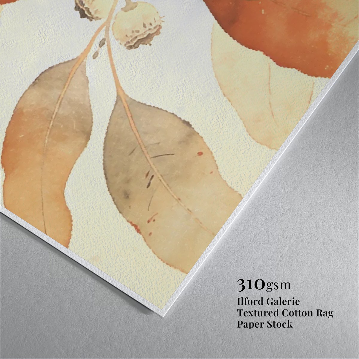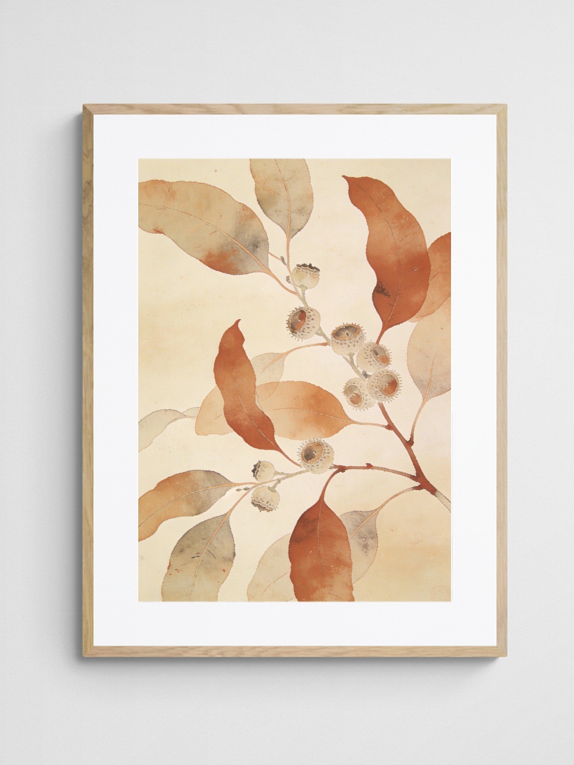 Add natural simplicity and beauty to your room with “Eucalyptus Minimalism”. This delicate watercolour artwork showcases eucalyptus branches adorned with gumnuts, rendered in muted tones of rust, beige, and earthy greys. The composition features gracefully elongated leaves and fine, intricate detailing that evokes a calming harmony and organic charm.