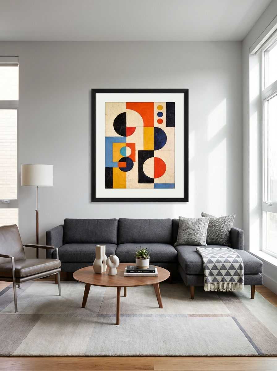 Elevate your space with a bold mid-century geometric abstract design. Featuring vivid primary colours and a textured finish, this artwork balances retro aesthetics with contemporary flair.