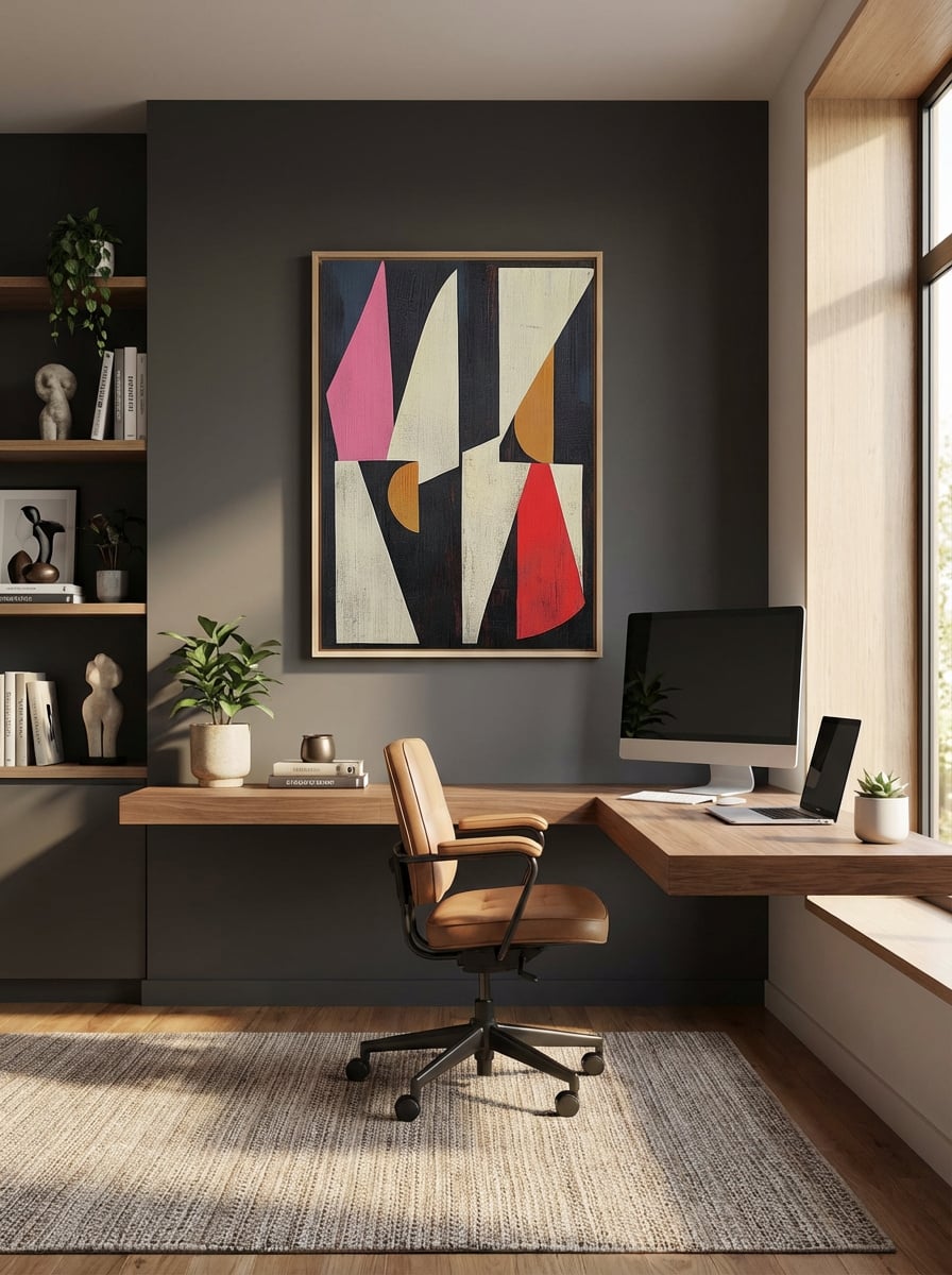 Perfectly balanced between minimalism and vibrancy, this artwork makes for an ideal addition to modern interiors. The dramatic contrast between the dark base and bright, crisp colours elevates any space, from a contemporary living room to an innovative workspace. It’s a brilliant statement piece that exemplifies the beauty of geometric abstraction.