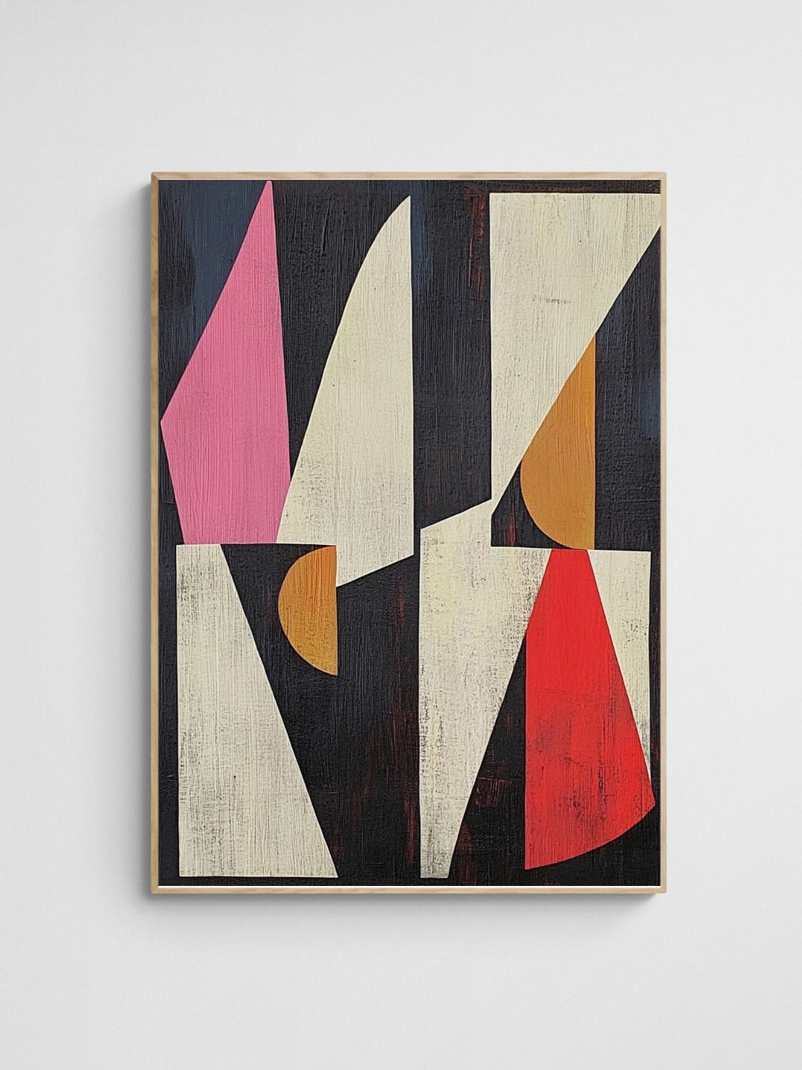 Geo Contrast 4 is a striking geometric abstract art print that captivates with its bold interplay of shapes and hues. Set against a textured black background, the sharp white, pink, orange, and red shapes create a dynamic sense of movement and contrast. The juxtaposition of curved and angular forms provides visual intrigue, drawing your eye across the composition in a rhythmic flow.