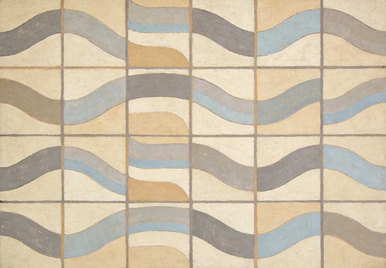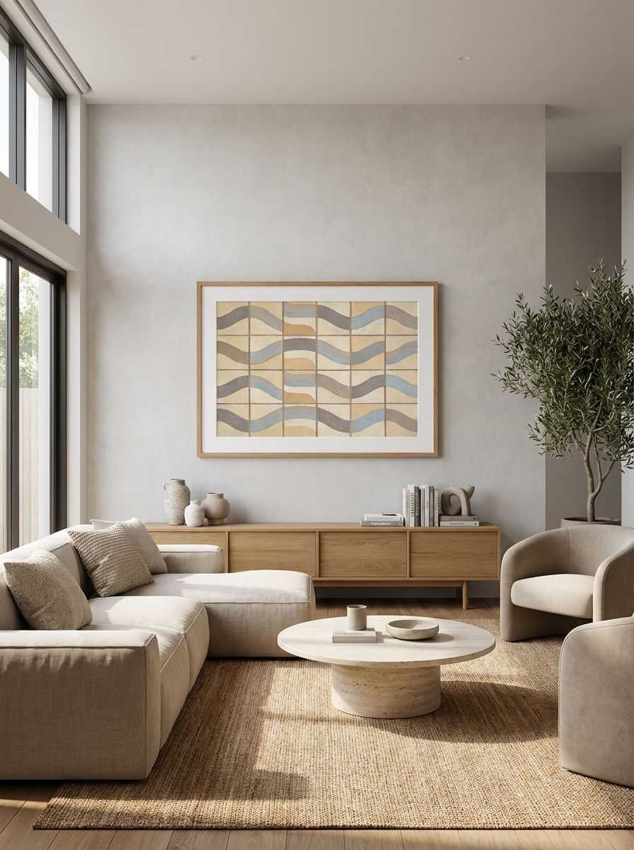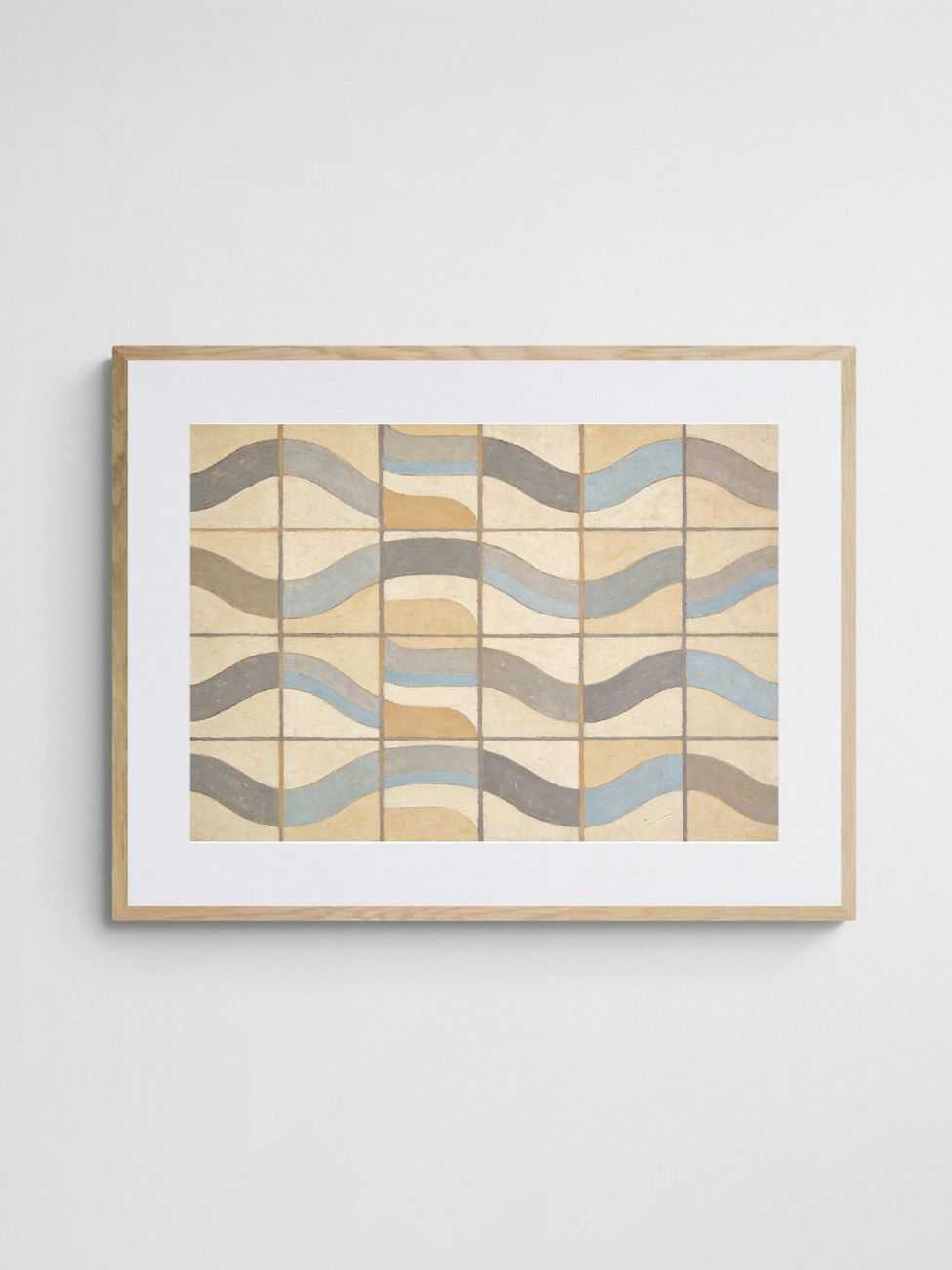 This artwork’s rhythmic, wave-like patterns convey a sense of calm and harmony while offering a sophisticated modern design. Its asymmetrical balance within the grid creates a dynamic interplay between order and freedom, reflecting its mid-century geometric roots. Ideal for enhancing rooms with a coastal or earthy tone, Gridwave complements light and natural decor palettes effortlessly.