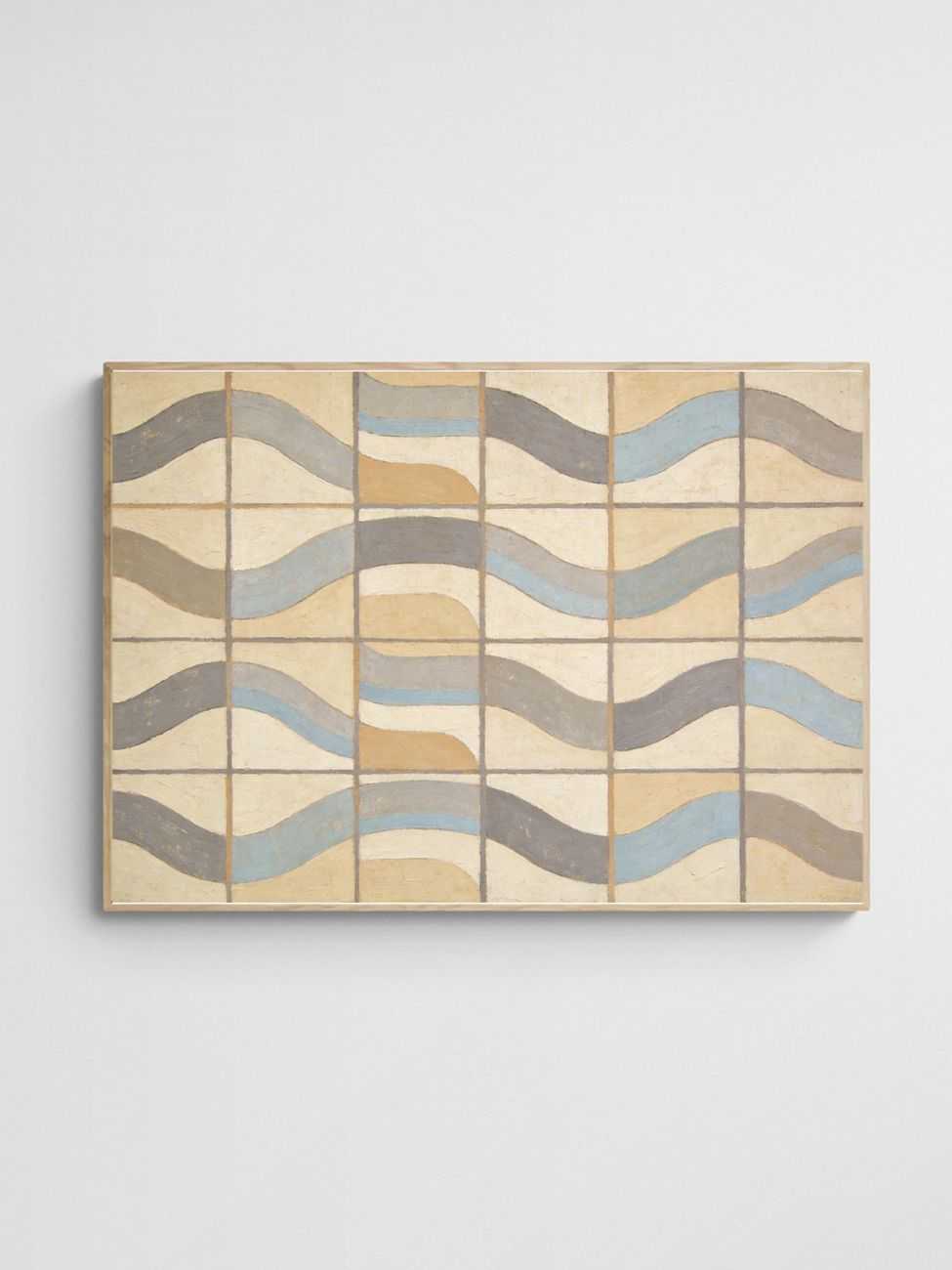 The ‘Gridwave’ artwork showcases undulating wavy lines within a structured grid arrangement, embracing a coastal-inspired aesthetic. Its neutral boho palette blends earthy beige, soft grey, and dusty pale blue, creating a serene and balanced composition. The subtle textural brushstrokes add depth and tactile charm, making it the perfect statement piece for contemporary and minimalist interiors.