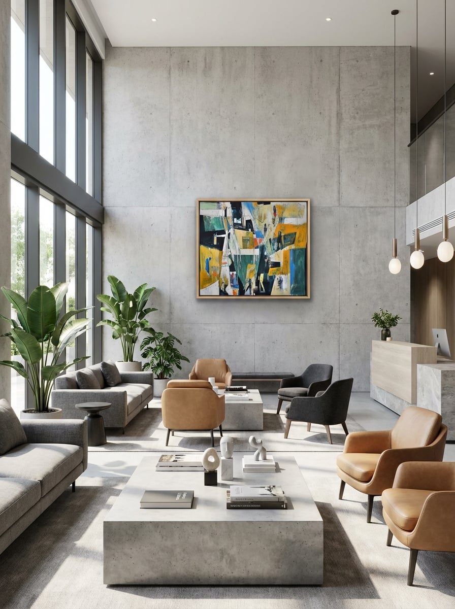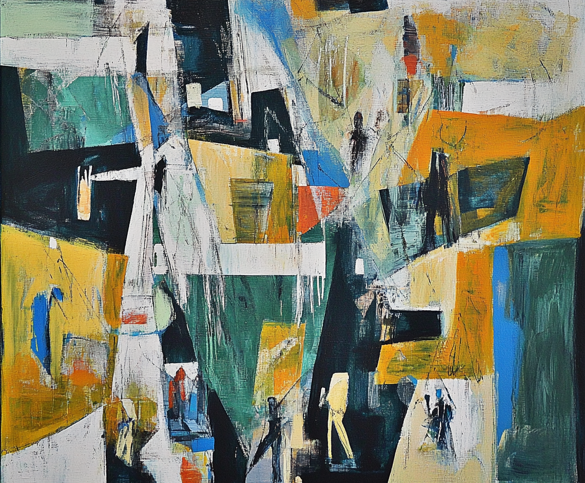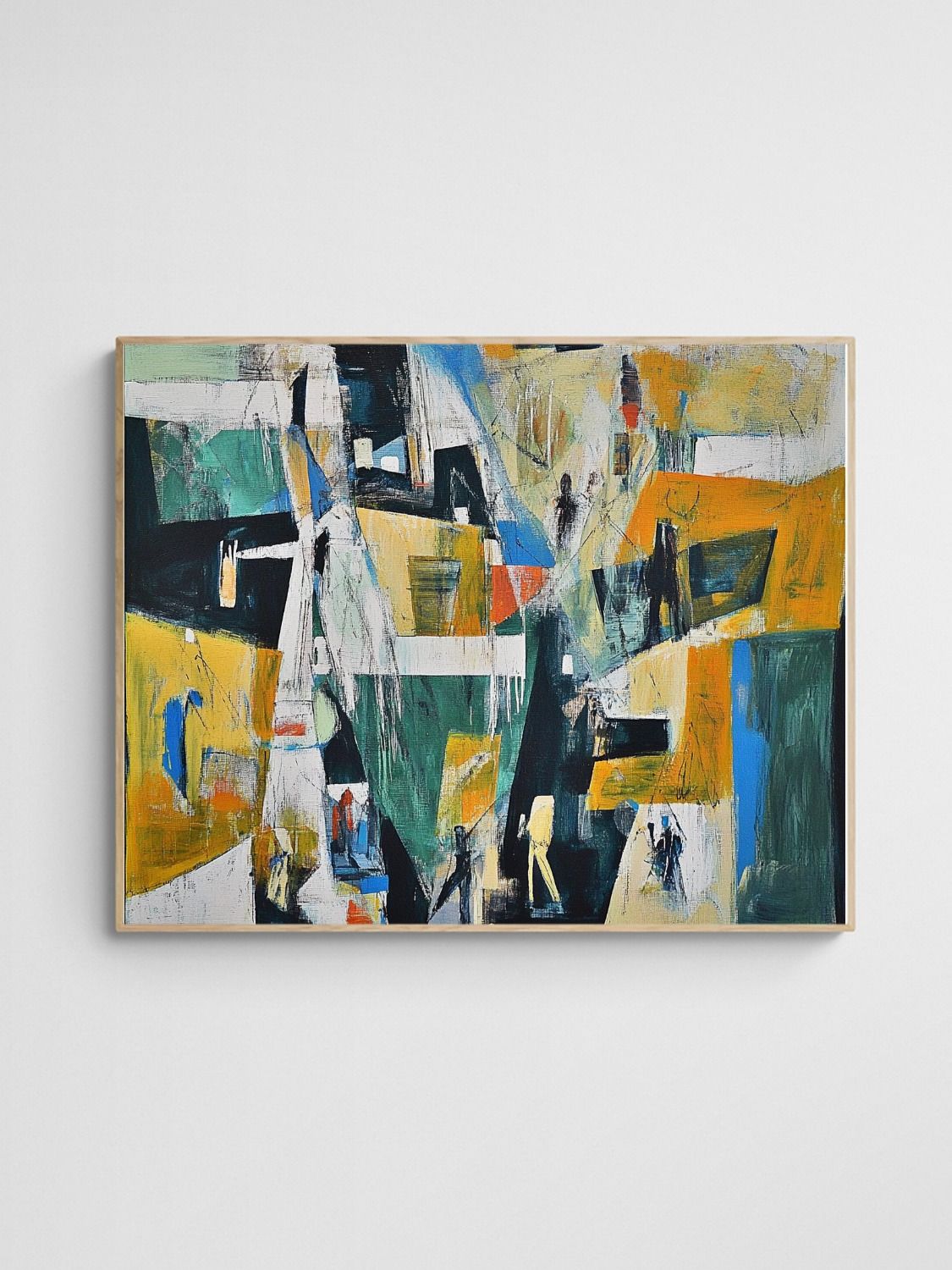 Add a sophisticated urban edge to your space with this striking abstract design. Featuring vibrant mustard yellows, deep greens, and contrasting blues, the artwork captures dynamic energy and subtle human presence. Its layered geometric shapes and textured strokes complement modern interiors perfectly.