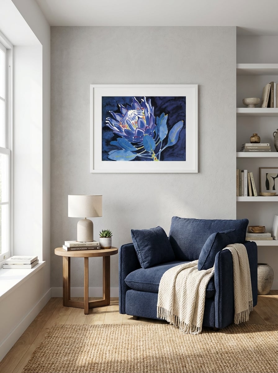 Elevate your space with “Indigo Dusk,” a captivating abstract native flower wall art print that embodies the serene beauty of the Australian landscape. This piece features a minimalist watercolour interpretation of a Protea, rendered in rich indigo and deep navy hues, accented with soft, cloud-like whites. Inspired by the tranquil moments of twilight, “Indigo Dusk” brings a sense of calm and sophistication to any room. Crafted for modern Australian homes, this botanical art print is ideal for those seeking to incorporate the 2026 trend of deep, calming colours and biophilic design. Printed on premium archival paper, it offers exceptional colour fidelity and longevity. Perfect for living rooms, bedrooms, or studies, this print is a testament to contemporary Australian art, blending natural elements with abstract expression. Free shipping Australia-wide.