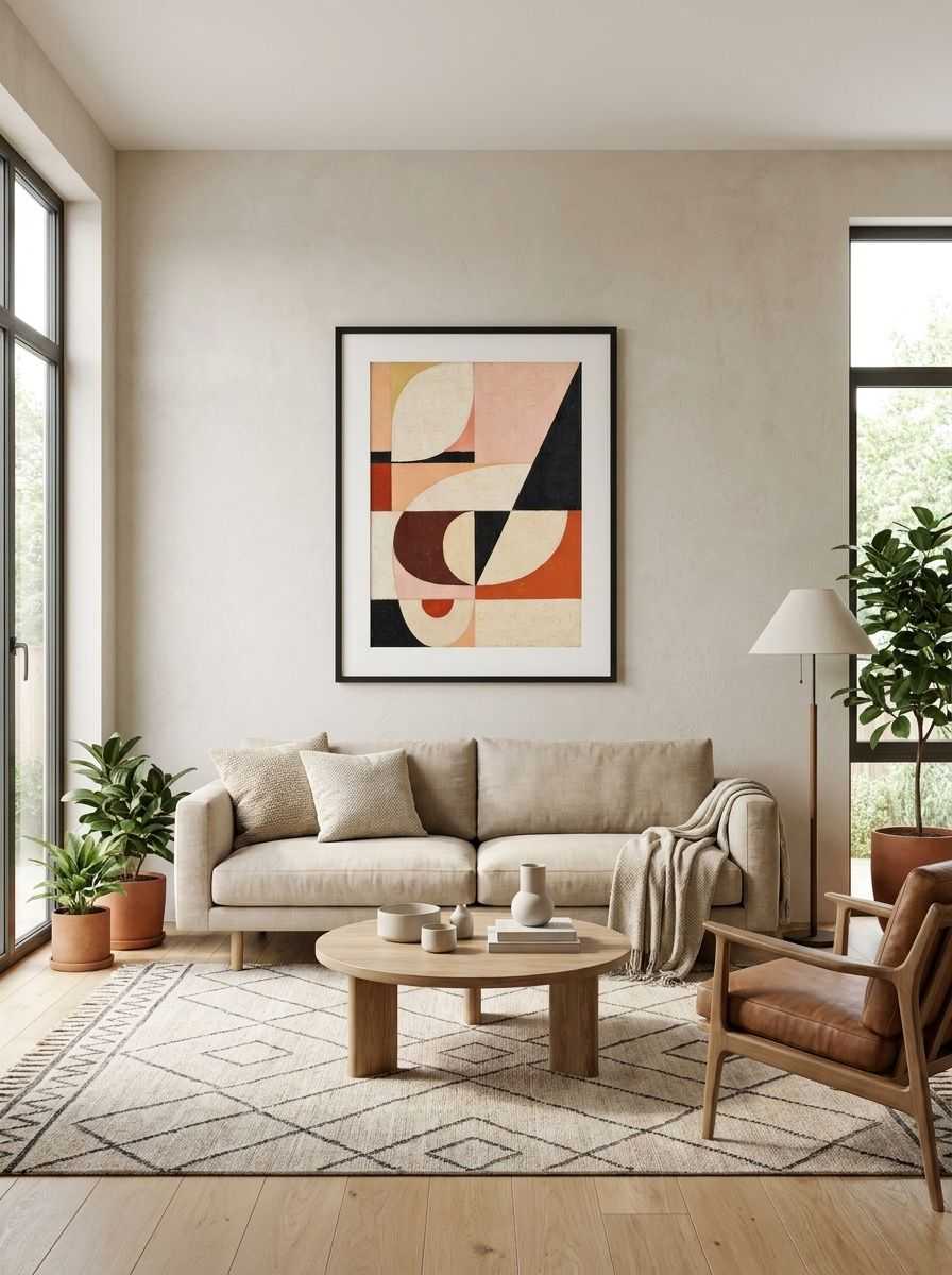 A neutral-toned geometric piece designed to complement modern spaces. With flowing curves, angular shapes, and earthy hues, this artwork embodies a balanced, mid-century-inspired aesthetic.