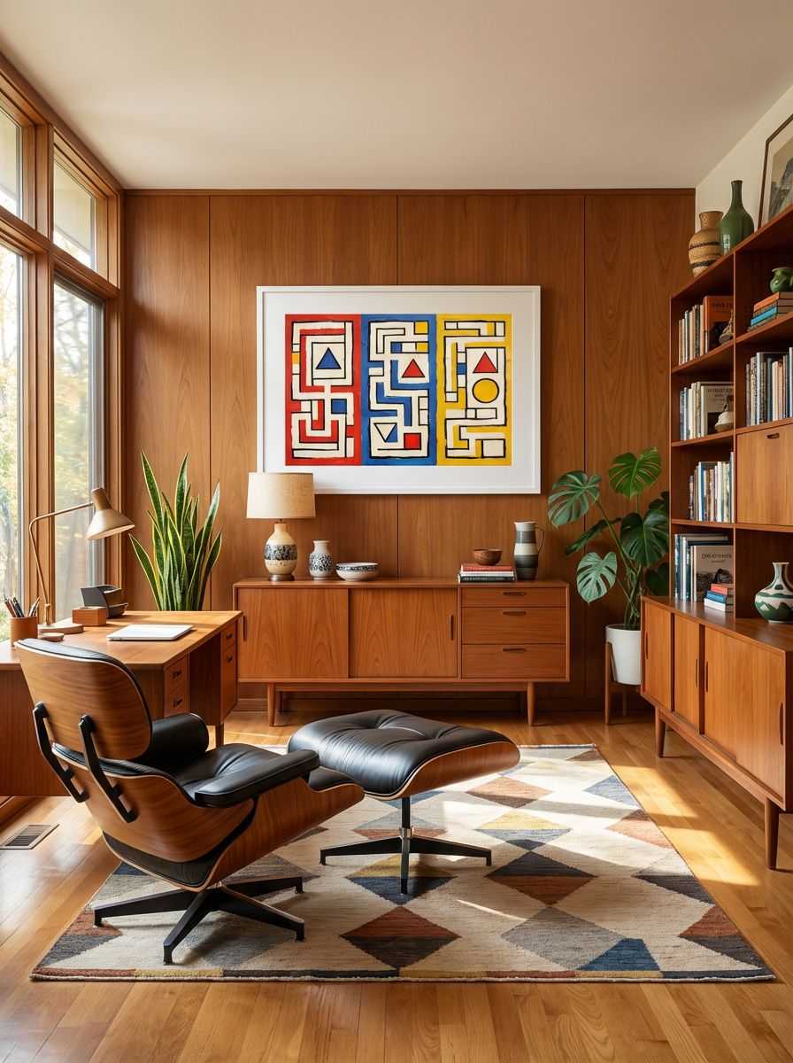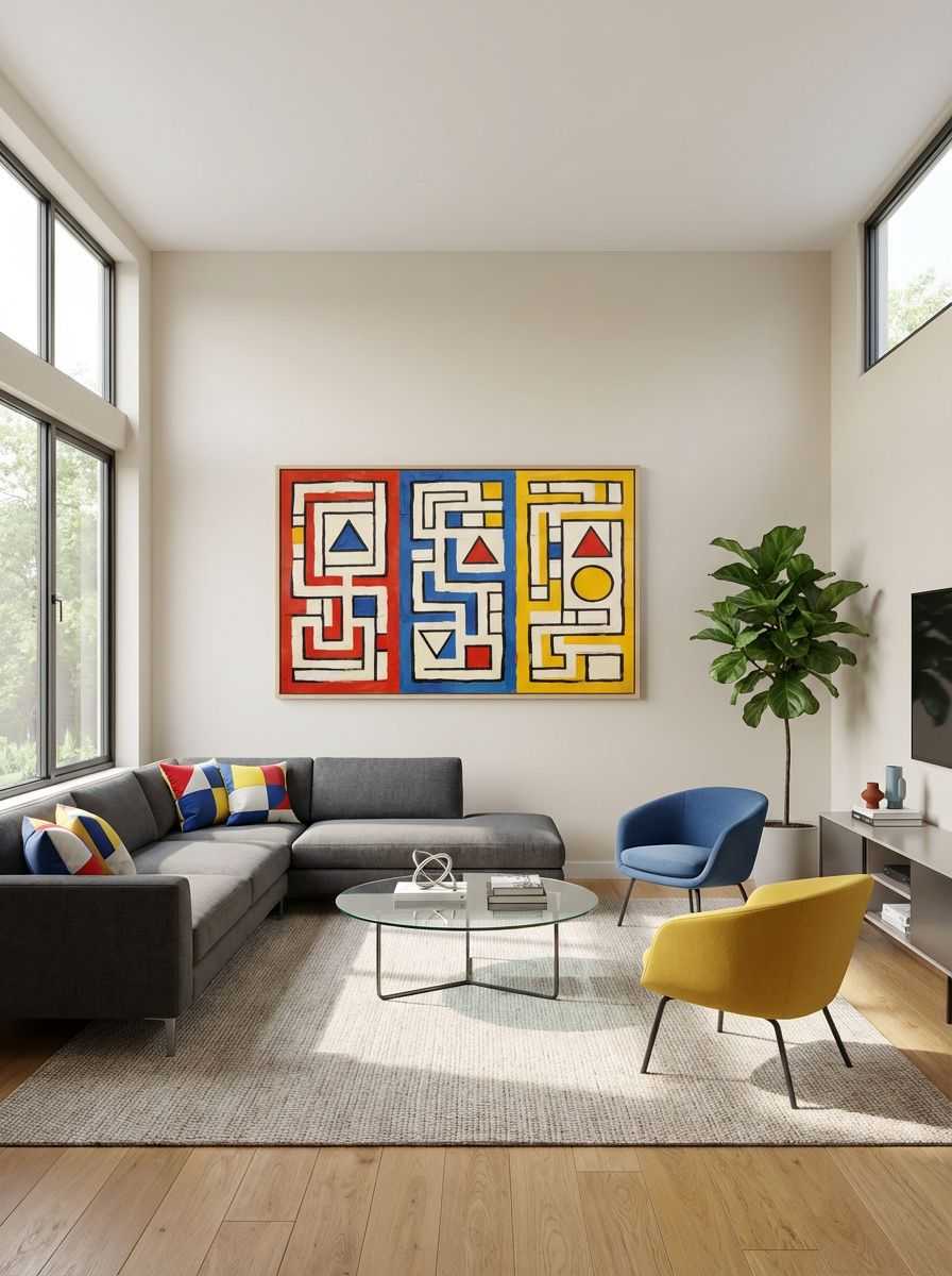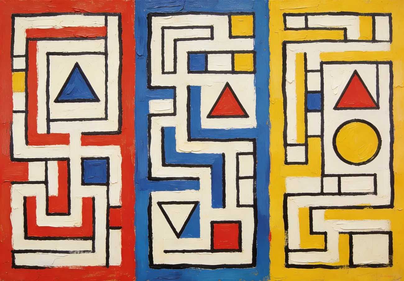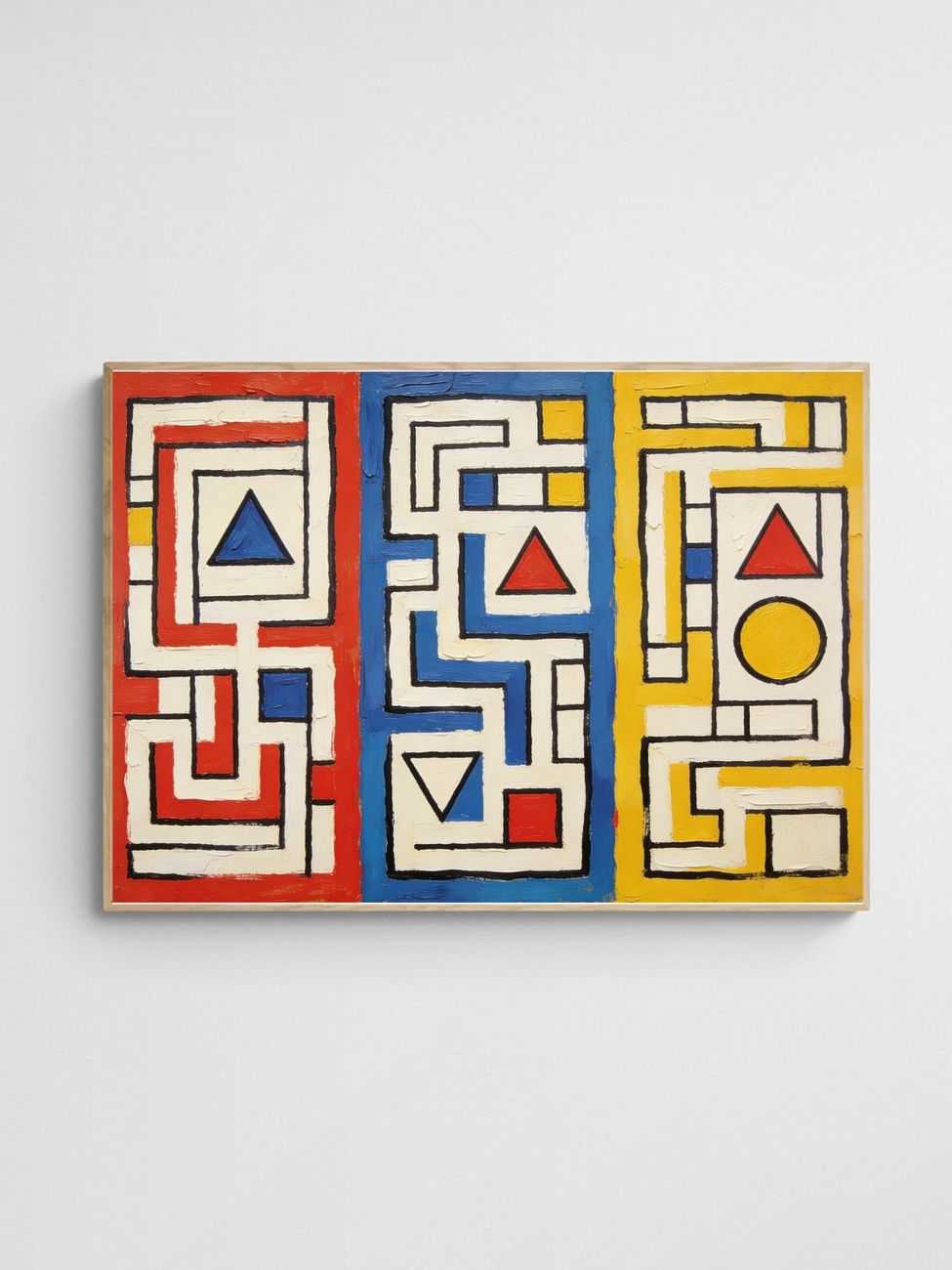 ‘Three Mazes’ is a captivating piece that embodies mid-century geometric design and vibrant creativity. The artwork features three distinct panels, each dominated by abstract mazes filled with interlocking lines, angular shapes, and primary colours of red, blue, and yellow. The hand-painted texture adds depth and character, while triangular and circular accents create moments of visual interest. Framed in thick black outlines, the design radiates a modern aesthetic reminiscent of timeless retro style, perfect for enhancing a contemporary living room, office, or artistic corner.