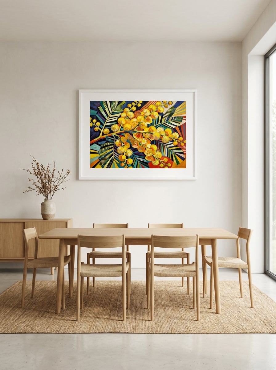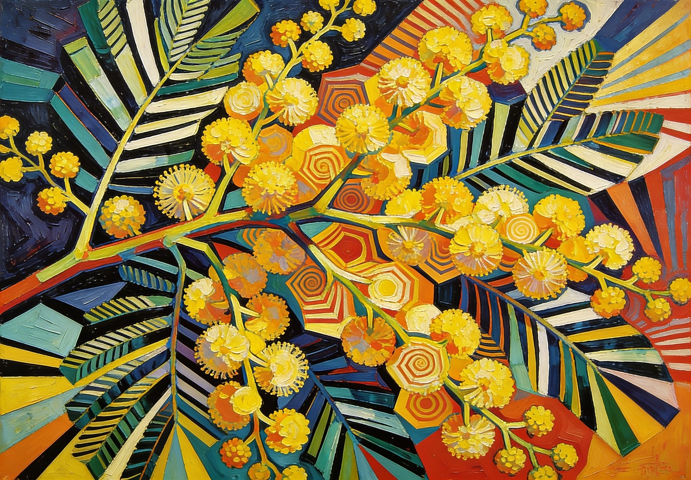 Bring the beauty of Australia’s native flora into your space with ‘Whirls of Wattle’. This dazzling artwork features a burst of golden wattle blossoms, detailed with intricate circular textures, set against bold abstract patterns in hues of deep blue, orange, green, and red. The dynamic composition captures the essence of modern, energetic design while celebrating the natural splendour of Australia’s iconic wattle.