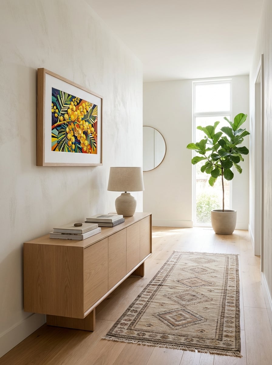 Radiating movement and vibrancy, the branches intertwine with sharp, geometric shapes and radiant lines, creating a mesmerising visual rhythm. The artwork’s playful use of contrasting tones and fine details makes it a standout addition to interiors seeking a lively, contemporary aesthetic while staying deeply rooted in Australian heritage.